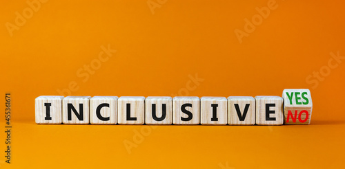 Inclusive yes or no symbol. Turned a wooden cube and changed words 'inclusive no' to 'inclusive yes'. Beautiful orange background. Business and inclusive yes or no concept, copy space.