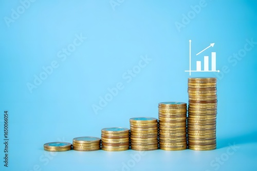 Increasing stack of gold coins with rising graph symbolizing financial growth and investment success