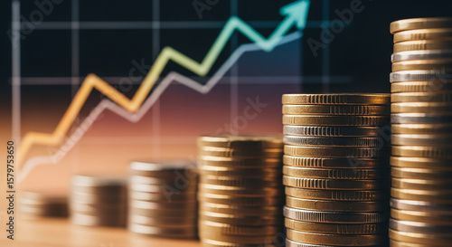 Increasing stacks of coins showing positive financial growth with upward trending arrow graph