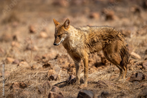 Indian Jackal or Canis aureus indicus calmly walking and observing the behavior possible prey at ranthambore tiger reserve, rajasthan, india