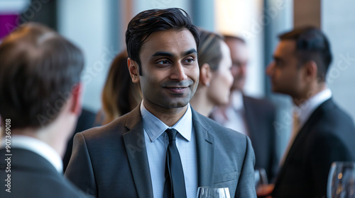 Indian man in a formal suit, attending a corporate event, confidently mingling with colleagues