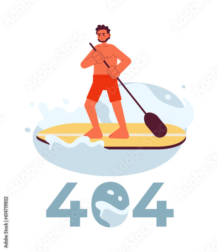 Indian man paddleboarding on lake error 404 flash message. Stand up paddle board. Empty state ui design. Page not found popup cartoon image. Vector flat illustration concept on white background