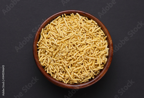 Indian popular snacks called Medium Sev or Bhujia Sev serve in wooden bowl isolated on dark background
