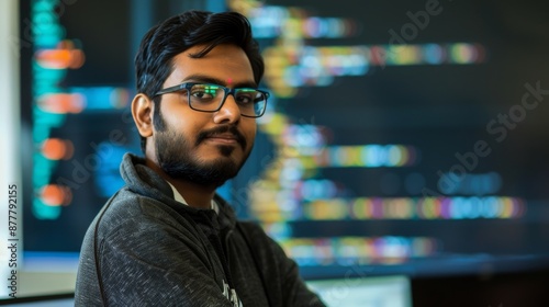 Indian software developer presenting code on screen, tech integration. Human expertise and technology in software development.