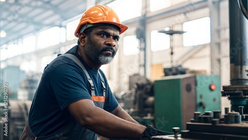 Indian Worker in Machine Shop Portrait – A factory worker operating heavy machinery, with a serious expression and tools at hand.