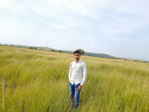 Indian young man, person on a meadow, young man in the wild, people in field.