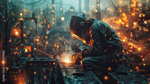 Indigenous welder working on a metal structure, with bright sparks and detailed industrial background, Industrial, Realistic