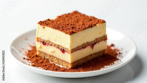 Individual portion of tiramisu, dusted with cocoa powder, on white , mascarpone, portion