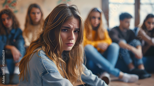 Individual sits alone on a park bench, looking solemn as friends walk away in distance.