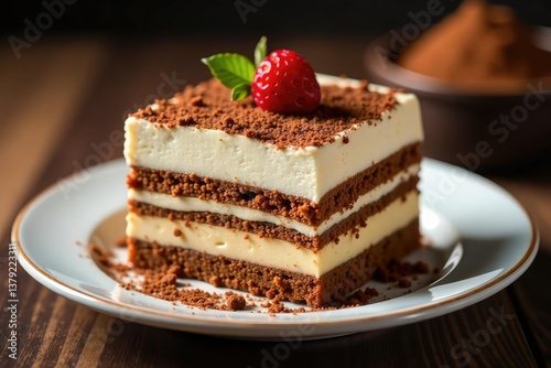 Individual tiramisu portion; layers visible, dusted cocoa , chocolate, single serving, baked goods