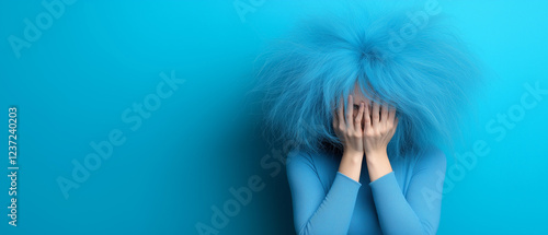 Individual with vibrant blue hair expressive in front of a solid blue background during a creative art session in a studio