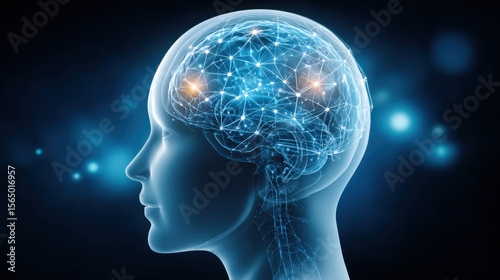 Individualized genomic medicine concept. Digital illustration of a human head with a glowing neural network, symbolizing brain activity and artificial intelligence connections.