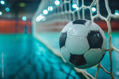 Indoor futsal moment with a ball touching the net in an energetic atmosphere of competition and teamwork