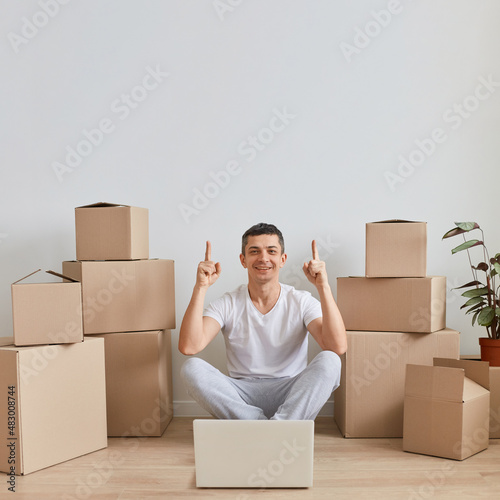 Indoor shot of brunette handsome man wearing white T-shirt sitting on the floor near cardboard boxes with stuff, posing in front of computer, pointing up, showing copy space for promotion.