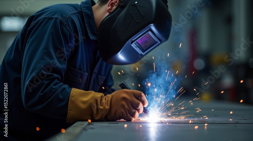 Indoor welding scene showing close-up of worker with mask and gloves, intense electric arc and flying sparks during metalwork