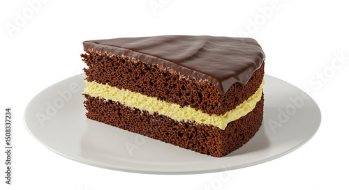 Indulge in a decadent slice of chocolate cake a comforting treat layered with creamy custard on transparent background