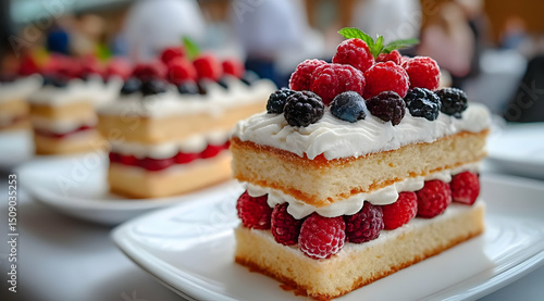 Indulge in layers of deliciousness with this vibrant dessert topped with fresh raspberries, blackberries, and creamy frosting. Perfect for celebrations.