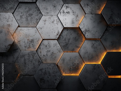 Industrial - Style Hexagonal Metal Wall Background with Warm Light Effect, for Interior Design, Tech Exhibition Hall, 3D Art Project Scenarios