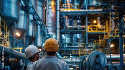 Industrial and Manufacturing Engineers and technicians working in industry refinery or power plant with blurred lights and structures in the background