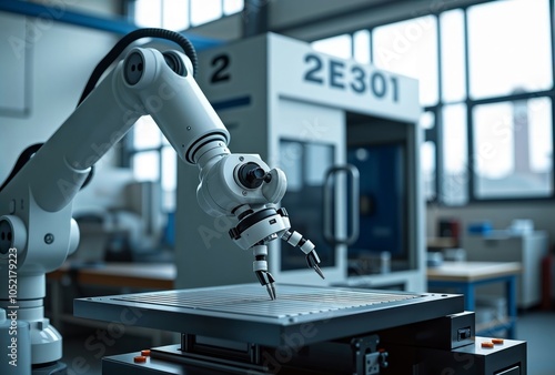 Industrial Automation. A robotic arm in a factory setting, precisely operating machinery.