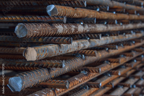 Industrial background. Rebar texture. Rusty rebar for concrete pouring. Steel reinforcement bars. Construction rebar steel work reinforcement. Closeup of Steel rebars.