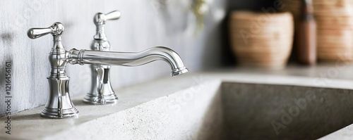 Industrial chrome faucet with exposed joints, paired with a concrete sink