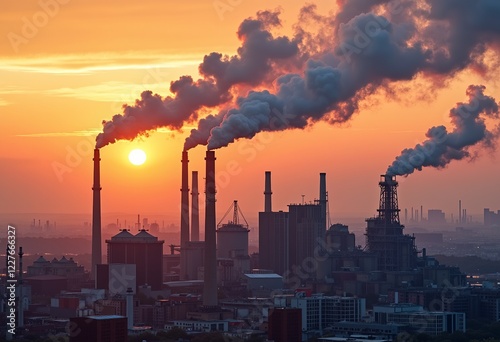 Industrial city aerial image: smokestacks with steam, sunset with orange sky, visual study of built environment, pollution, man and nature clash.