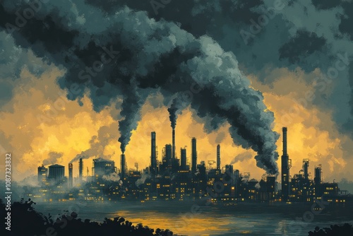 Industrial Complex at Dusk with Smoke Plumes and Water Reflection