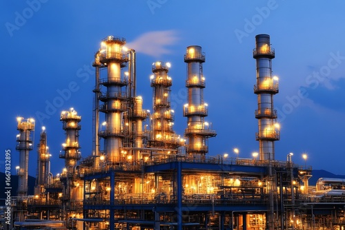 Industrial complex at twilight, lit by numerous lights on tall structures
