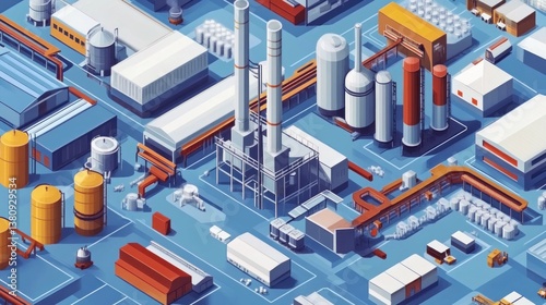 Industrial complex network of interconnected facilities. Intertwined manufacturing and processing plants with storage tanks, pipelines, and vehicles. Detailed isometric view of production layout