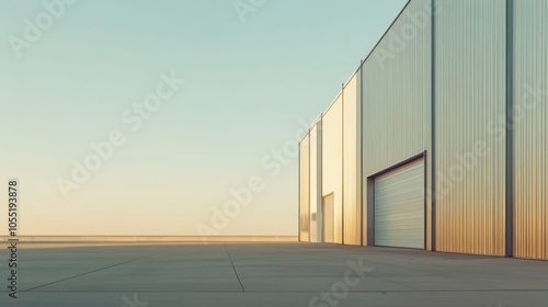 Industrial Dawn: A large, modern warehouse stands against a soft, pastel sky at dawn. The building's sleek, metallic facade and large garage doors create a sense of scale and purpose, with the vast.