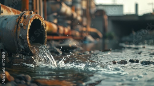 Industrial drain pipe leaking dangerous waste into water, pollution impact blur factory background.