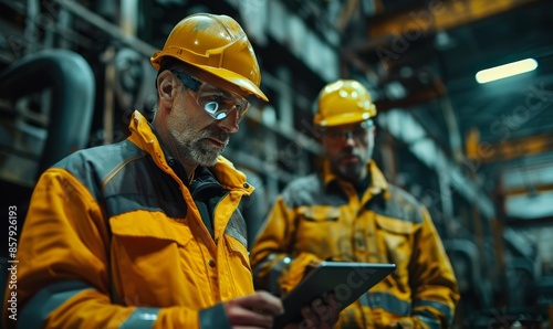 industrial engineer and businessman in safety helmet working in factory, planning, discussing and training workers with tablet in metalwork place , teamwork and team concept