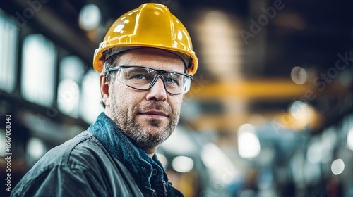Industrial engineer in safety helmet upper body portrait with professional workwear, natural side lighting in factory environment and soft bokeh background