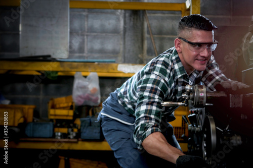 Industrial engineer worker wearing helmet and safe glasses operating with machinery at manufacturing plant factory, working with machine in industry concept