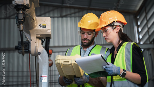 Industrial engineers are in charge of controlling the automated robot arms machine welding robots in industrial manufacturing factory.
