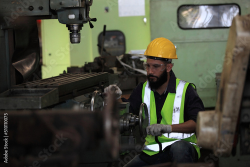 Industrial Engineers with machine.production engineer in industry. He checking or push metalwork control in industrial factory for Concept Successful of Work.