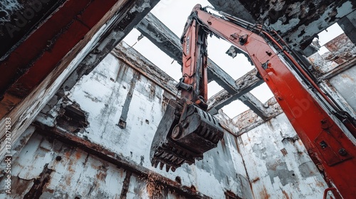 Industrial Excavator Operating in Abandoned Building with Exposed Walls and Rooftop, Showcasing Urban Decay and Construction Equipment Dynamics