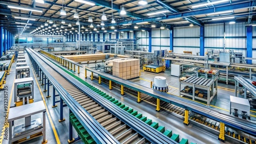 Industrial factory production line with conveyor belts, machinery, and quality control checks, illustrating the efficient planning and manufacturing process.
