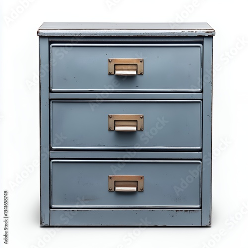 Industrial Filing Cabinet: A sturdy, vintage-inspired filing cabinet in muted gray with three drawers, perfect for organizing important documents.