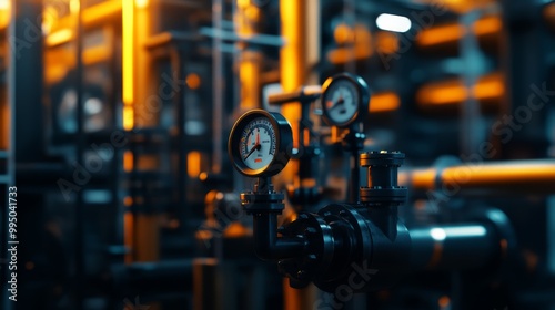 Industrial Gauges and Piping Network: Close-up of Precision Engineering showcasing complex machinery, measurement, control, and industrial processes.