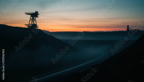 Industrial Landscape at Dusk with Mine Structure and Fog