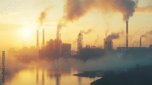 Industrial landscape at dusk with thick smoke emitting from factory chimneys, creating air pollution over a river with reflections.