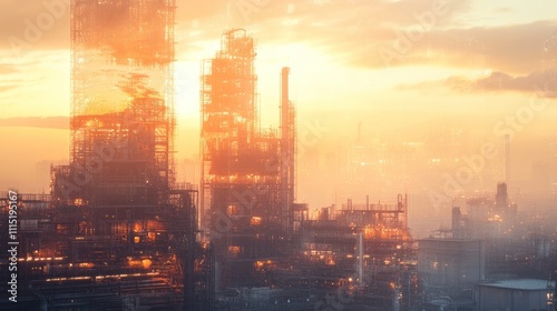 Industrial landscape at sunset, showcasing towering structures and a hazy atmosphere.