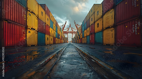 Industrial Landscape: Wet Rails Between Shipping Containers