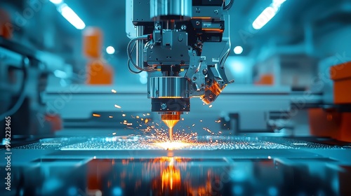 Industrial Laser Cutting, A bright blue laser precisely slicing through metal in an expansive workshop, showcasing advanced technology and skilled craftsmanship in a clean environment