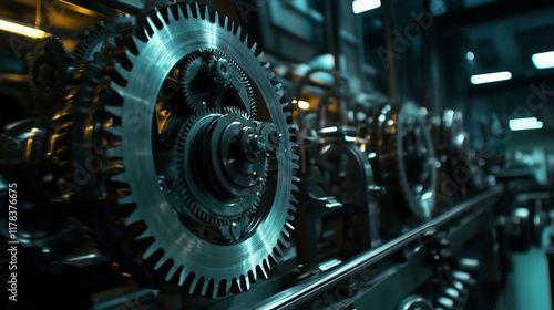 Industrial machinery and engineering mechanism with gears and cogs at work showcasing precision manufacturing technology