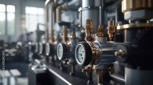 Industrial Machinery Close-up: Polished Metal and Brass Fittings