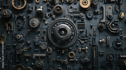 Industrial machinery components and gears arranged in a detailed pattern showcasing mechanical design and engineering textures.