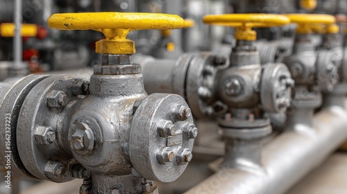 Industrial metal valve controls on gas pipeline, closeup view showing mechanical detail and texture, used for flow regulation in utility or factory settings